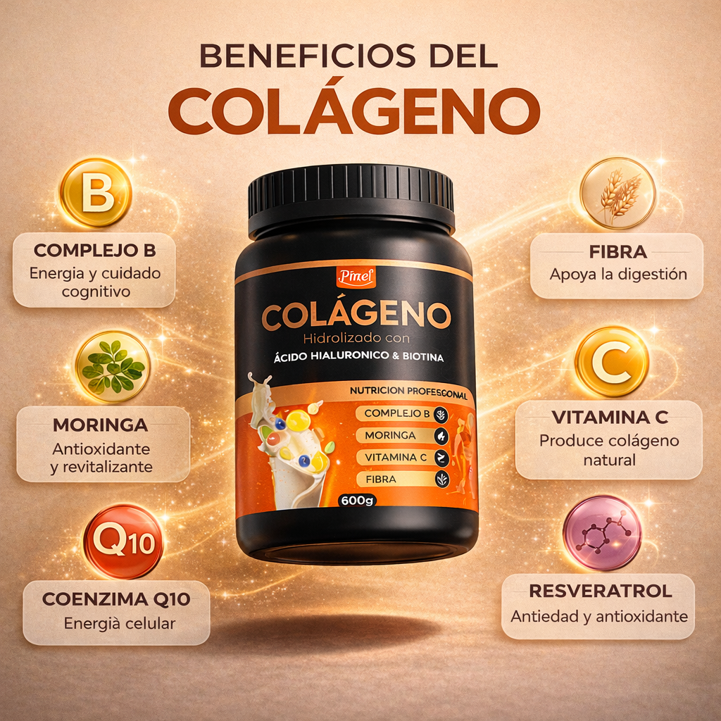 Su fórmula combina Colágeno hidrolizado con ingredientes reconocidos por su aporte al bienestar general y cuidado de la piel, uñas y cabello