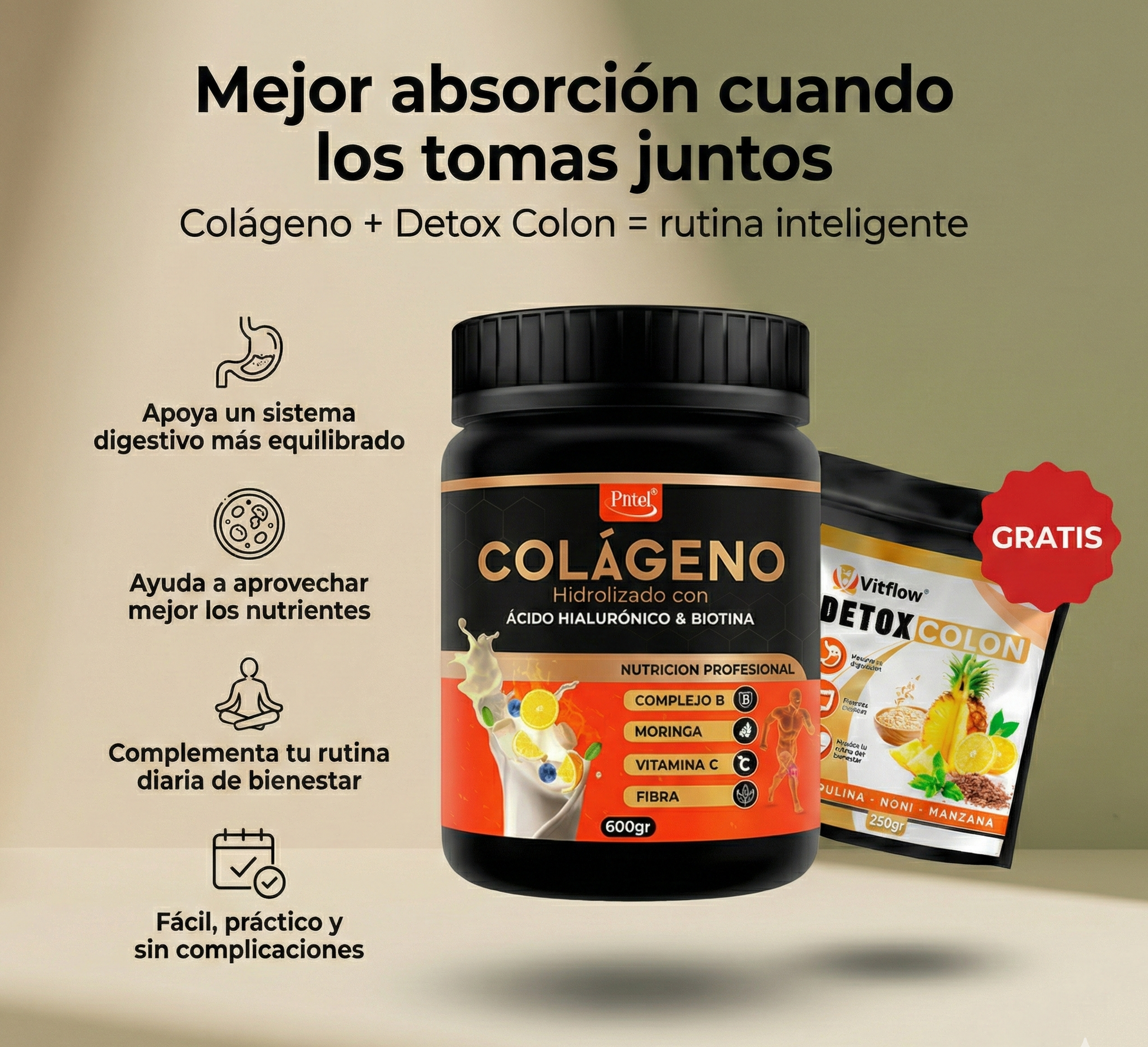 El Detox Colon complementa el colágeno ayudando a mejorar la digestión y favoreciendo una mejor absorción de nutrientes para potenciar sus resultados